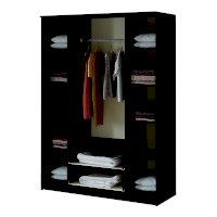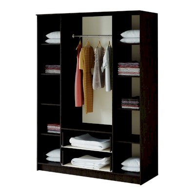 Вместительный четырёхстворчатый шкаф Фиеста справится с большим гардеробом и другими вещами. Модель выполнена из качественной ЛДСП. Корпус сделан в темном цвете венге, а фасады – в светлом лоредо. Комплектация представляет собой центральную зону с двумя нижними выкатными ящиками и отделения со штангой для одежды на плечиках. Справа и слева расположились многочисленные полки для вещей. В створки центральных дверок вмонтированы зеркала.