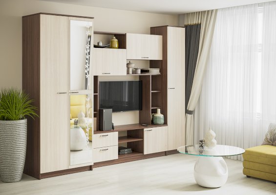 Качественная стенка за эту стоимость. Недостатки пока не обнаружены. За свои деньги очень хорошая гостиная. Смотрится стильно и красиво. Собирается легко!