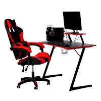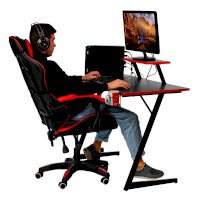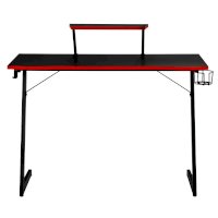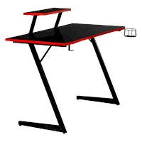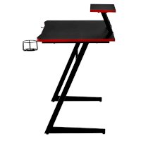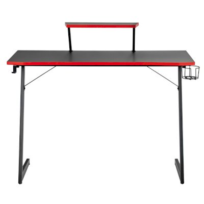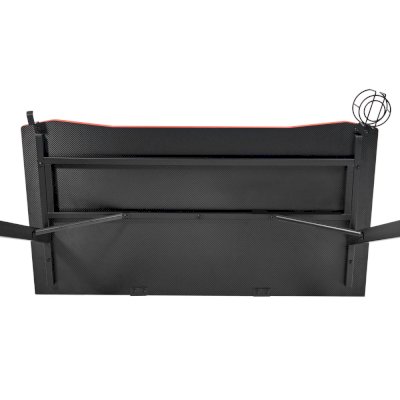 Конструкция простая и прочная: стальная рама выдержит серьезную нагрузку (заявлено до 200 кг). Стол на двух L-образных опорах впишется в любой уголок дома, его легко перемещать, удобно собирать и разбирать. Несмотря на лаконичность дизайна, он очень стильно смотрится: строгая черная столешница «под карбон» отделана красной кромкой.