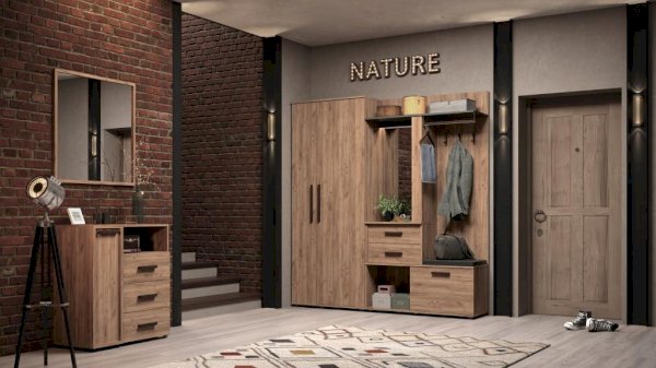 Комбинированный модуль Nature 70 Шкаф МЦН можно расположить в прихожей в составе шкафной группы или автономно. В небольшом по габаритам модуле сочетается всё необходимое: открытая вешалка, тумба для обуви, полка для головных уборов, выдвижные ящики, зеркало с подсветкой. Встроенная светодиодная подсветка включается при помощи аккуратного кнопочного выключателя. Выдвижные ящики оснащены шариковыми направляющими. Откидной фасад обувной тумбы дополнительно фиксируется при закрывании магнитной защелкой. В комплектацию входит мягкая подушка из черной экокожи с золотой строчкой. Собрать шкаф МЦН можно как на правую, так и на левую сторону.