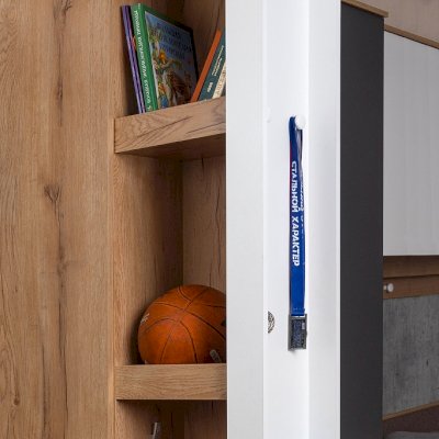 Нередко хобби ребенка перерастает в нечто большее и становится не только способом реализовать свои творческие способности, но и делом всей жизни. Уникальный выдвижной шкаф для хобби ЛОЙС 85 с двумя зонами хранения: внутренняя закрытая зона и фасадная часть с карманами. Внутри шкафа полки с ограничителями и ниша с крючками, где можно хранить форму для тренировок, мячи, ролики, наборы для творчества и другие аксессуары для хобби. Зона хранения на самом фасаде включает в себя: карман для высоких бумаг и ватманов, ручку, выполненную виде полочки, и два крючка, на которые удобно повесить заработанные медали, скакалки, элементы декора. Выдвижная система ЛОЙС 85 на роликах оснащена широкими шариковыми направляющими полного выдвижения. С ЛОЙС 85 в комнате появится место для хранения вещей тесно связанных с увлечениями детей. Модуль обязательно крепить к стене!