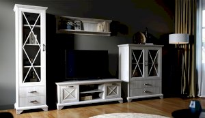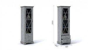 Пенал-витрина добавит уюта в интерьер гостиной в стилях неоклассика или прованс. Белые рамочные фасады с фактурой и рисунком натурального дерева, декоративные крестообразные накладки, фигурные ножки и карниз все это придает комнате элегантный и светлый вид. За прозрачным фасадом можно расположить предметы декора, красивый сервиз или книги. Выдвижные ящики на телескопических направляющих предназначены для хранения различных вещей. Мебель выполнена из экологичных материалов.