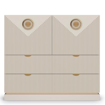 Конструкция комода включает два широких ящика, а также два закрытых отделения с дверками. Украсить интерьер можно разместив на столешнице комода декоративные предметы, вазы или любимые фотографии.