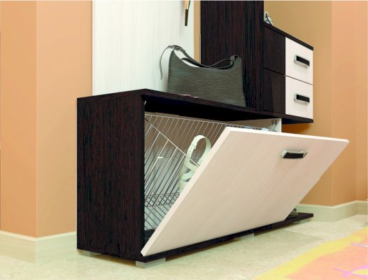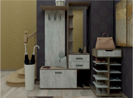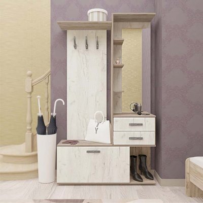 Состоит из полки с крючками, тумбы.