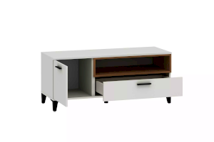 Тумба оснащена полкой за распашной дверкой и ящиком, который выдвигается плавно и бесшумно благодаря шариковым направляющим. Открытая ниша может быть собрана как на правую, так и на левую стороны, и в ней можно удобно расположить книги или элементы декора, а высокие опоры придают внешнюю легкость и обеспечивают быстрый и легкий доступ во время уборки.