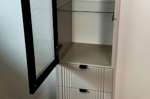 Шкаф оснащён надёжной металлической ручкой и имеет удобное внутреннее наполнение: надёжные полки за стеклянной и глухой дверцами, а также выкатной ящик. Это позволяет рационально использовать пространство.