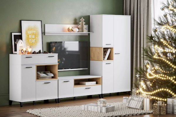 Шкаф оснащен полками за распашными дверками и открытой нишей, которая может быть собрана как на правую, так и на левую стороны, и в ней можно удобно расположить книги или элементы декора, а высокие опоры придают внешнюю легкость и обеспечивают быстрый и легкий доступ во время уборки.
